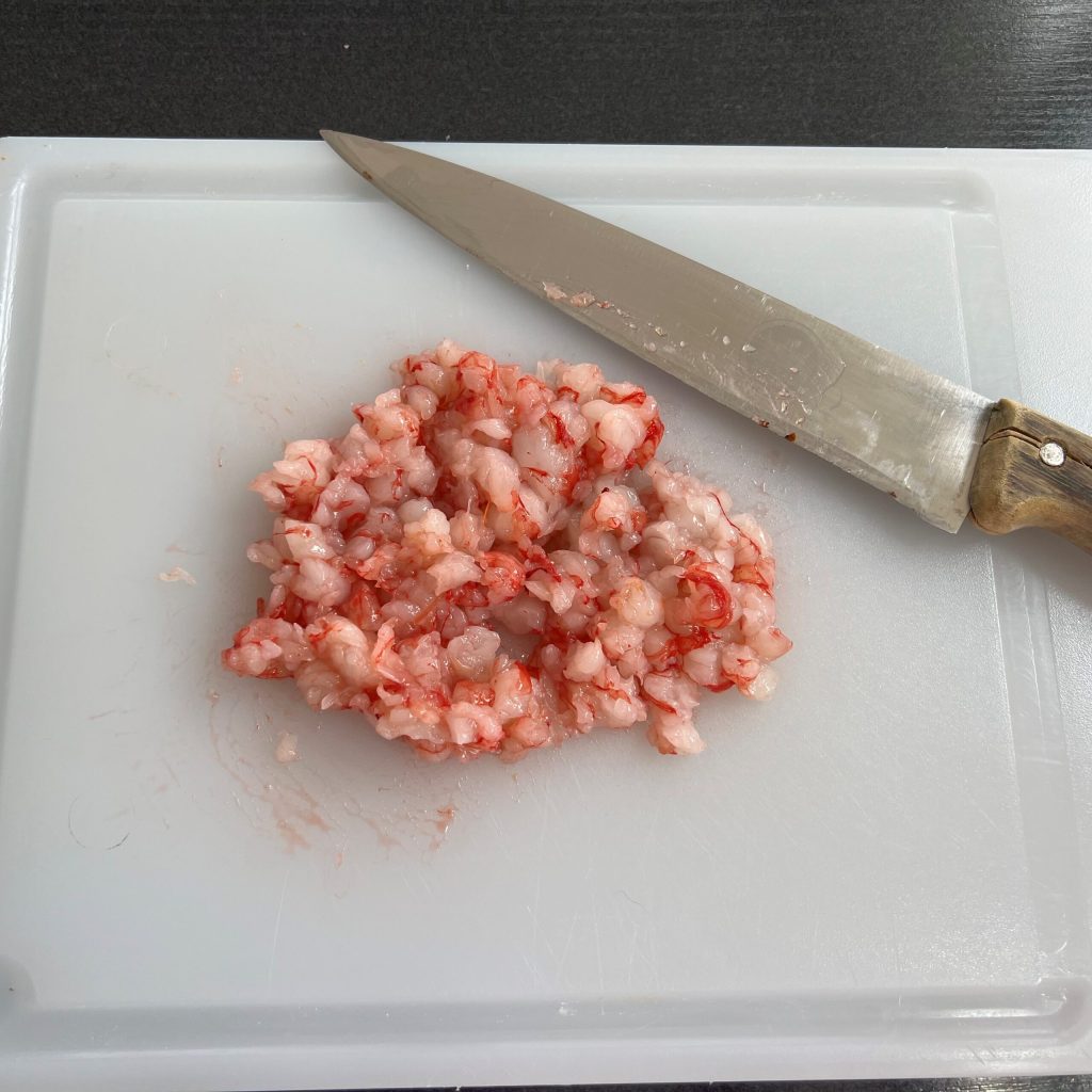 • Reservando as cabeças e as carapaças, corte a polpa dos camarões com uma faca sem deixá-la muito fina