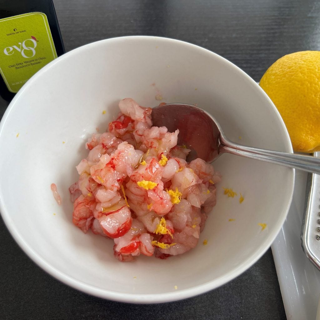 • Tempere a tartare de camarão vermelho com 2 colheres de sopa de azeite EVO, uma pitada de sal e um pouco de casca de limão ralada