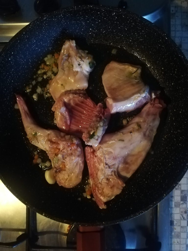 Adicione os pedaços de coelho e sele as carnes dourando de ambos os lados;
