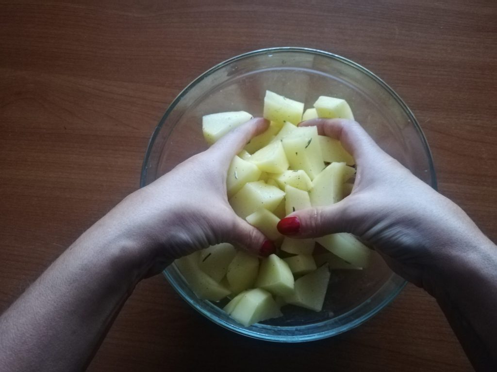 À parte, misture as batatas cortadas em cubos com óleo, sal, pimenta e alecrim;