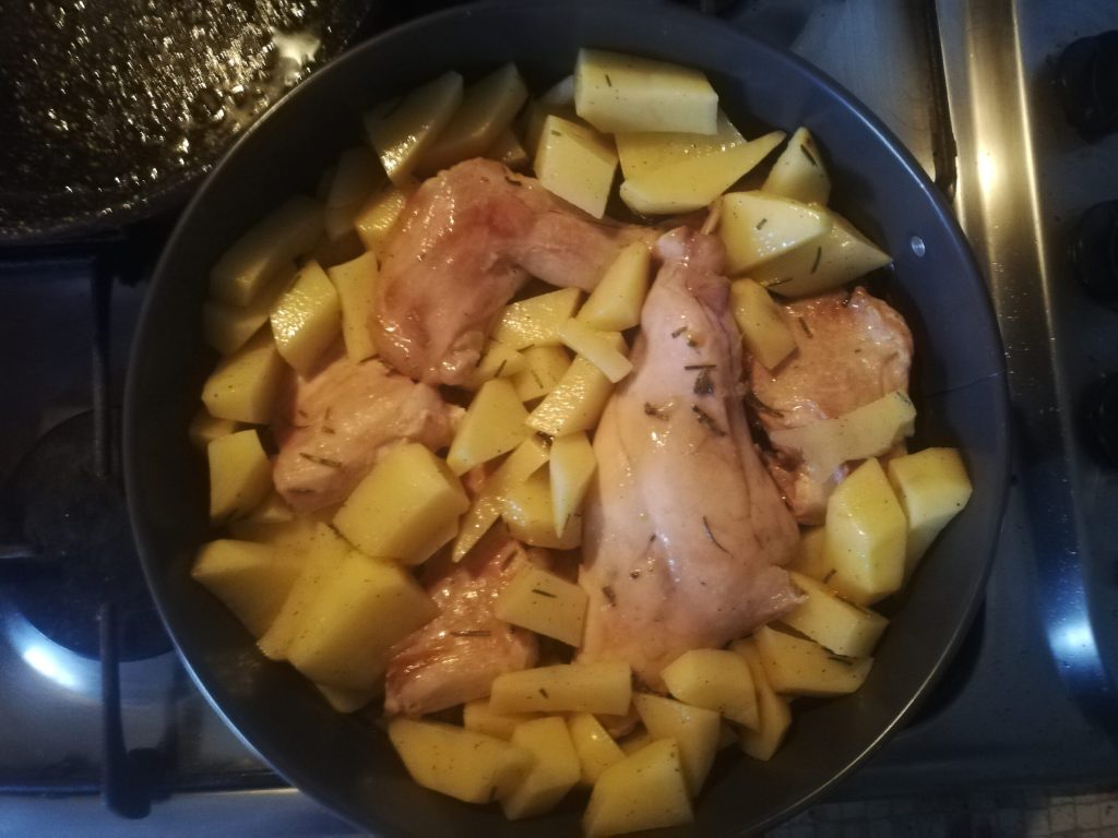 Il coelho combina tanto com batatas como nesta receita, mas também com pimentões, alcachofras, azeitonas, tomates.