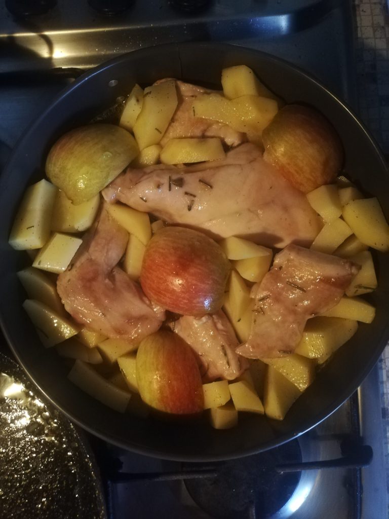 Esta Receita de coelho com maçãs e batatas tem um ingrediente secreto que durante o cozimento no forno deixa as carnes macias;