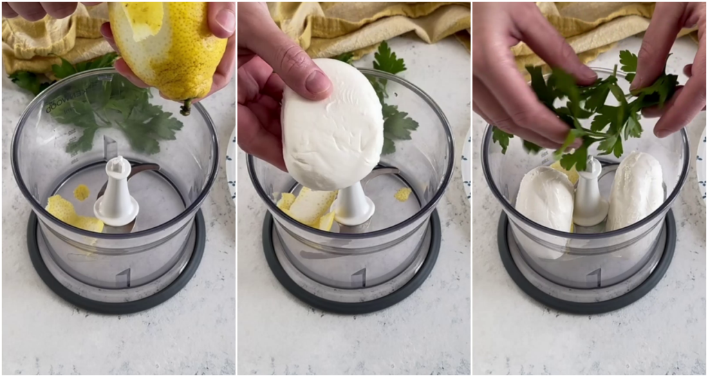 • Para preparar as almôndegas de muçarela, primeiro lave muito bem o limão e a salsinha. Retire a parte amarela da casca do limão e coloque no copo do liquidificador. Adicione também as muçarelas e a salsinha. Feche e bata por 1 ou 2 minutos.