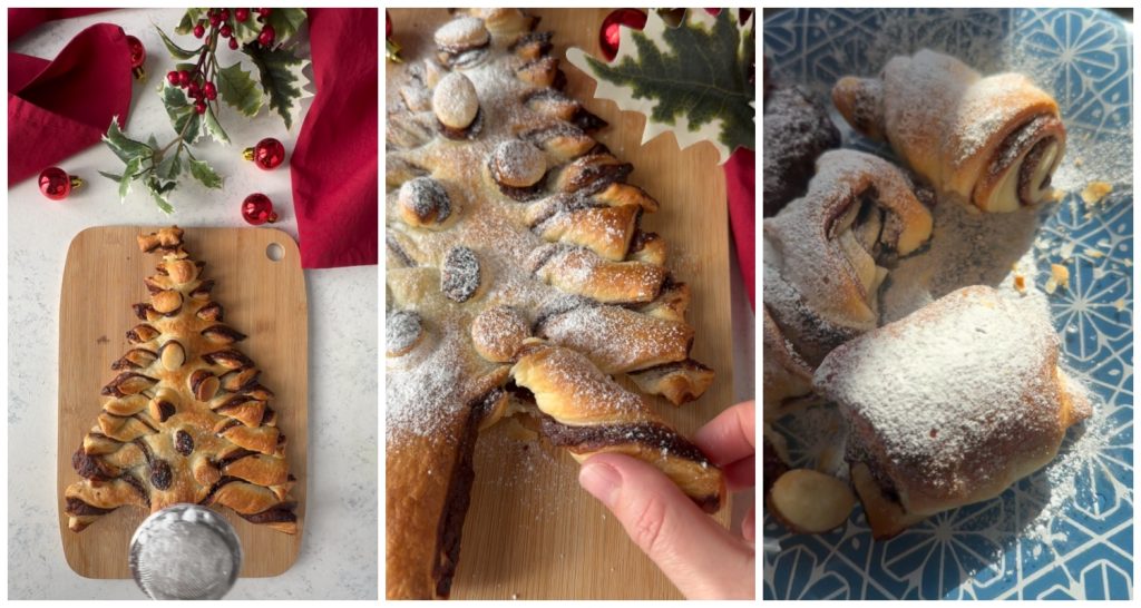 Das sobras, você pode fazer croissants deliciosos que podem ser assados junto com a árvore de Nutella. Asse em forno estático pré-aquecido a 180°C por 20-25 minutos, até que a árvore esteja bem dourada. Retire do forno e polvilhe com açúcar de confeiteiro. Bom apetite!