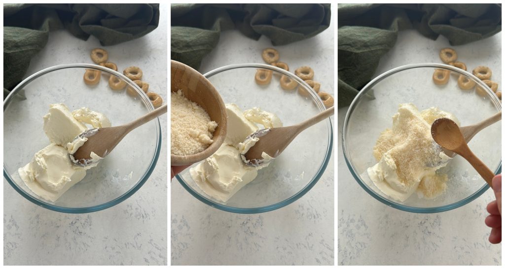 Agora dedique-se à preparação do creme de queijo: em uma tigela, coloque o queijo cremoso (pode ser o light ou o clássico), adicione o parmigiano ralado (pode ser também o grana), o sal (pouco, pode até não colocar, já que o presunto cru é bem salgado).