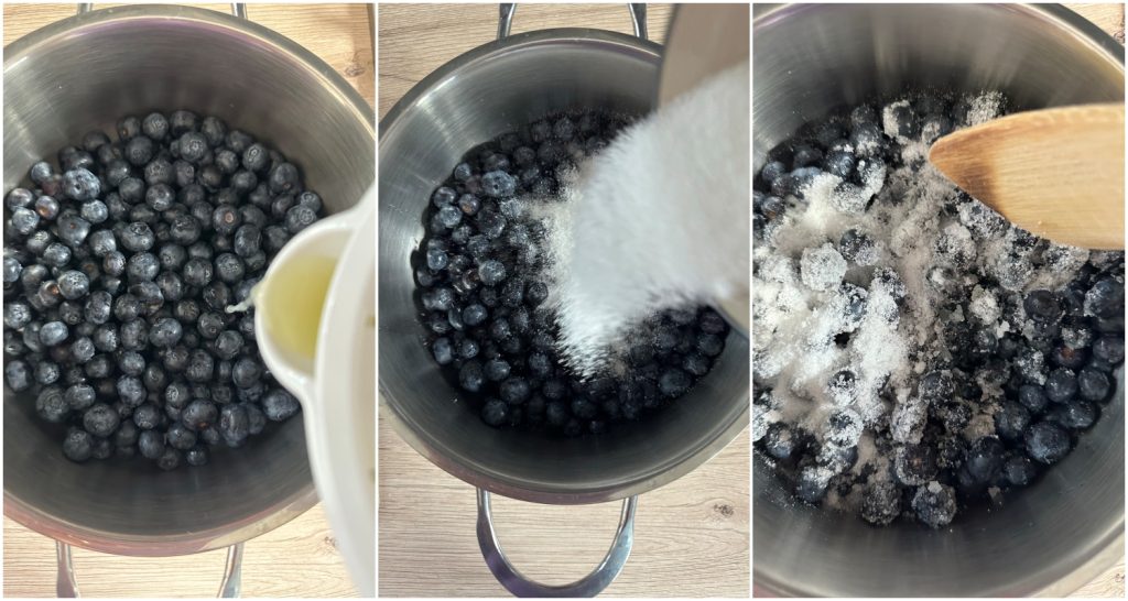 Leve ao fogo, adicione o açúcar e comece a mexer. A partir do momento em que a compota começar a ferver, cozinhe em fogo baixo por 20 minutos. Você verá que os mirtilos começarão a se desfazer e formarão um purê.