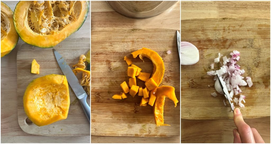Para preparar o macarrão e abóbora à napolitana, primeiro descasque a abóbora (sim, a delica pode ser usada com a casca, mas dava uma cor feia. Usei a casca à parte). Lave bem. Corte em pedaços pequenos e reserve (os pedaços pequenos cozinham mais rápido). Pique também uma cebola.