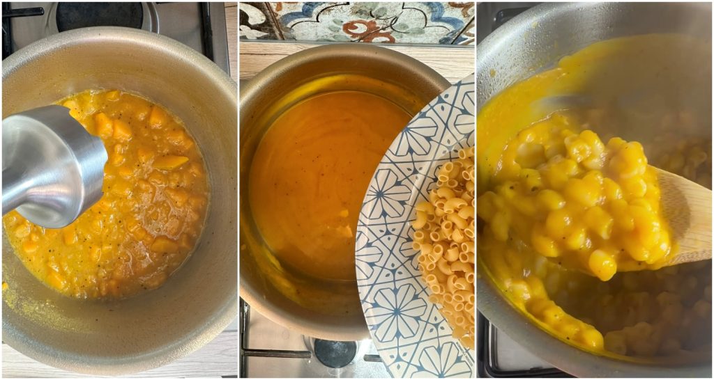 Quando a abóbora estiver macia, bata com o mixer de imersão até obter um creme liso e homogêneo. Aqueça e adicione o macarrão. Cozinhe pelo tempo indicado na embalagem. Adicione água para prolongar o cozimento ou se o creme de abóbora estiver muito seco. Ao final do cozimento, sirva, adicione salsinha fresca picada e uma pitada de parmesão. Bom apetite!