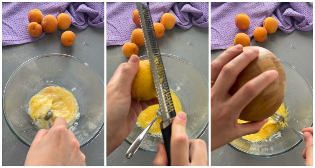 Acrescente também a casca de limão ralada e o açúcar. Misture por 1 minuto e tome cuidado para não formar grumos.