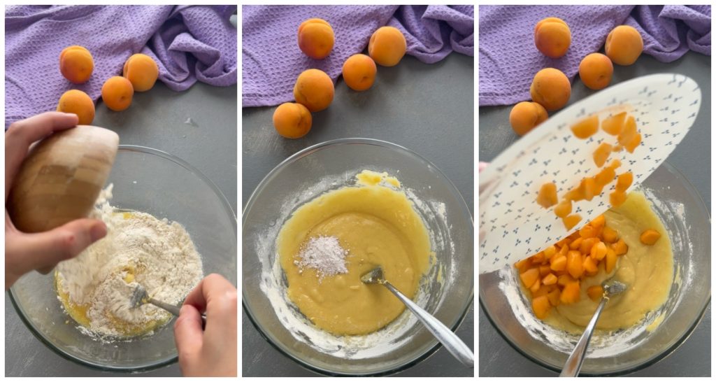 Adicione também a farinha, continuando a mexer. Trabalhe por alguns minutos até obter uma mistura homogênea. Por fim, adicione o fermento em pó e misture novamente. Neste ponto, acrescente à massa os damascos descascados e cortados em pedaços pequenos. Uma última mexida e a massa está pronta!