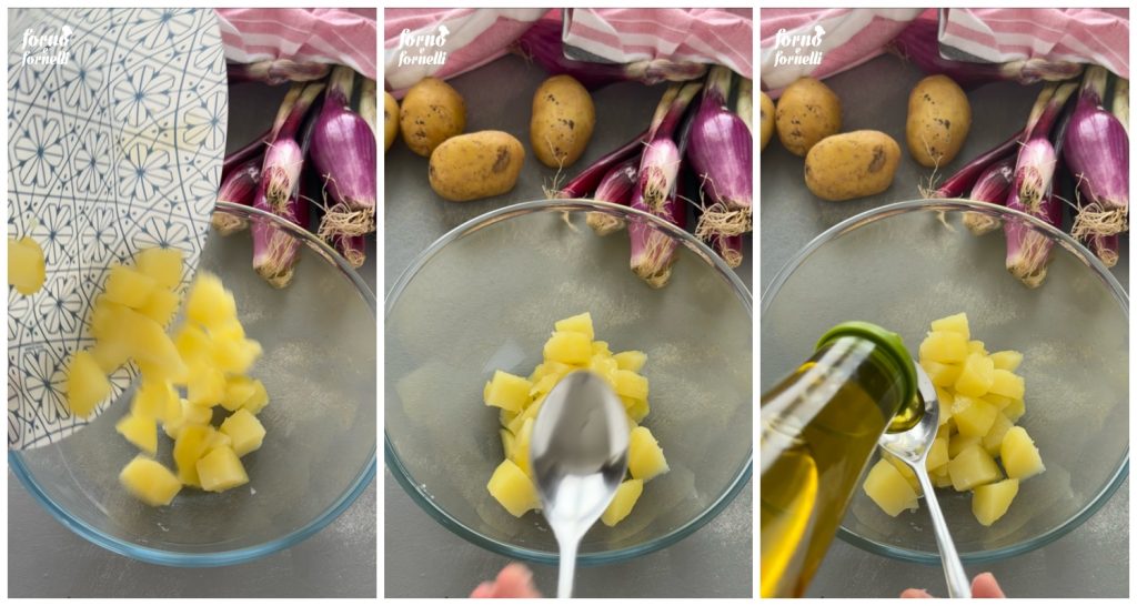 Enquanto as batatas cozinham, descasque a cebola e corte em fatias finas. Coloque as batatas cozidas e escorridas em uma tigela grande, tempere com 2 colheres de sopa de vinagre e 2 colheres de sopa de azeite de oliva.