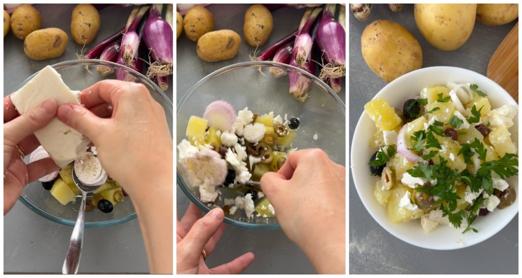 A salada de batata com azeitonas e feta é uma delícia mediterrânea que reúne os sabores frescos e ousados da culinária tradicional grega e mediterrânea. Esta salada é uma celebração de ingredientes simples mas deliciosos: batatas macias, azeitonas saborosas e queijo feta cremoso. A adição de ervas aromáticas e um tempero leve completam o prato, conferindo-lhe uma frescura incomparável. É o acompanhamento perfeito para qualquer refeição, uma explosão de sabor e um verdadeiro deleite para o paladar. Sua simplicidade e sabores autênticos a tornam uma escolha irresistível para quem deseja saborear a culinária mediterrânea em toda a sua glória.