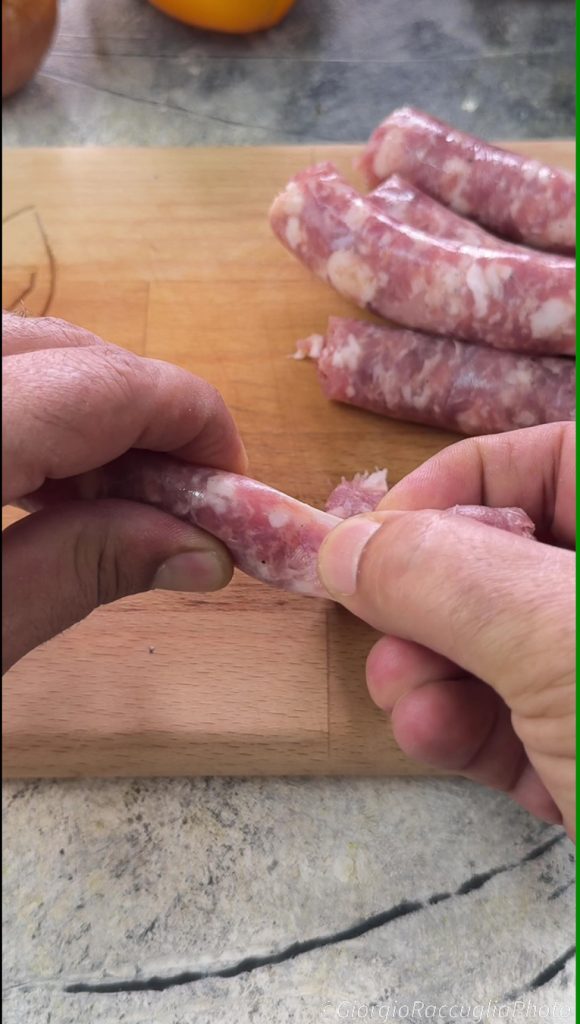 Para preparar as almôndegas de linguiça e pimentões, comece retirando a linguiça da tripa.