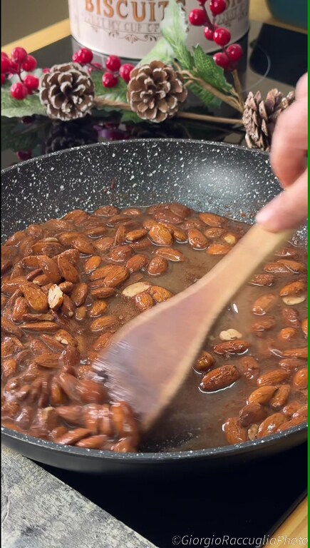 Para preparar as amêndoas pralinadas, primeiro transfira as amêndoas para uma frigideira antiaderente,