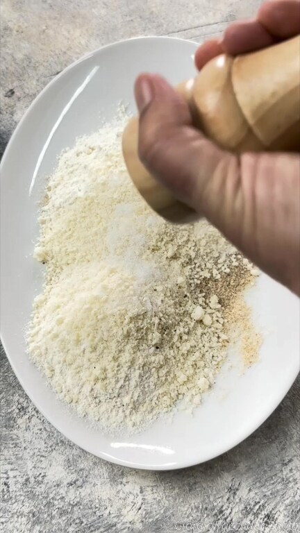 Para preparar a receita de bife à parmegiana à pizzaiola, comece com a farofa. Despeje a farinha de rosca em uma bandeja,
