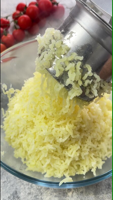Após 20 minutos, retire da água fervente e deixe esfriar. Em uma tigela grande, amasse as batatas,
