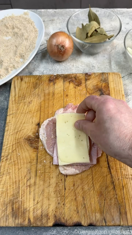 Coloque sobre a fatia empanada meia fatia de presunto cozido e