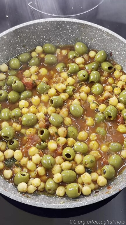 Para preparar o grão-de-bico com as azeitonas cozidos na frigideira, comece derramando um fio de azeite na frigideira, adicione algumas folhas de sálvia e deixe murchar. Adicione o grão-de-bico escorrido,
