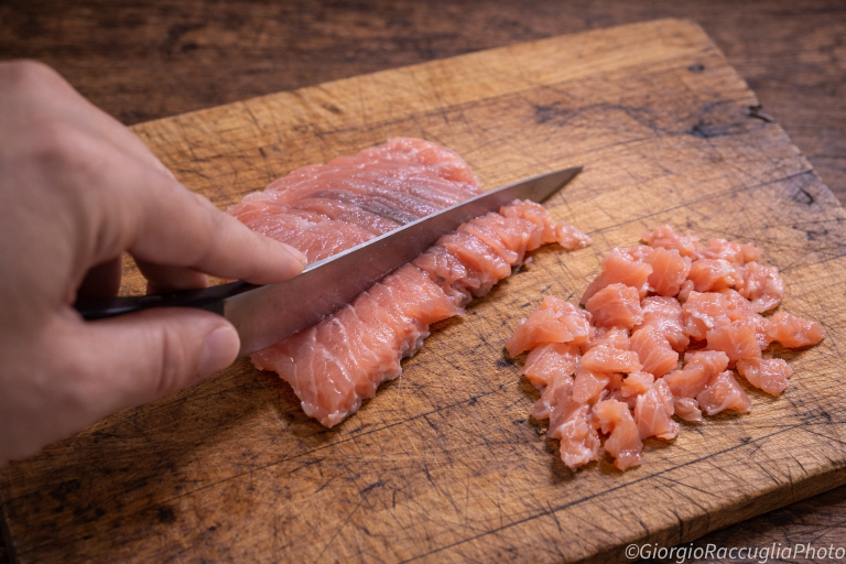 Para preparar as gravatinhas com salmão, primeiro corte o salmão em cubos não muito pequenos e reserve.