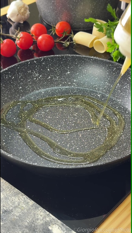 Para preparar a pasta alla puttanesca, comece colocando em uma frigideira um fio de azeite de oliva extravirgem,