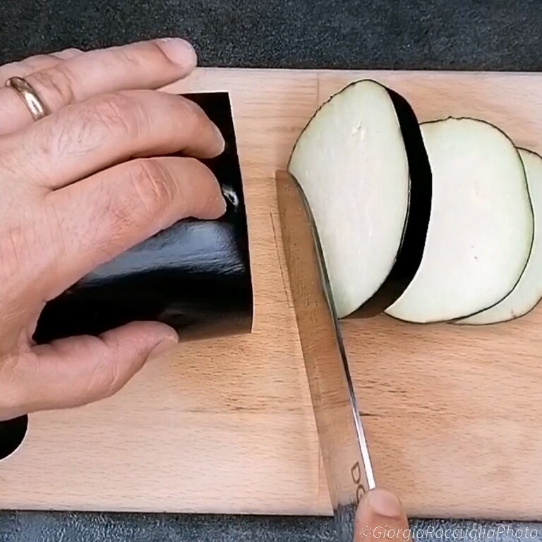Para preparar a berinjela grelhada com molho de salsa, corte as berinjelas em fatias não muito finas,