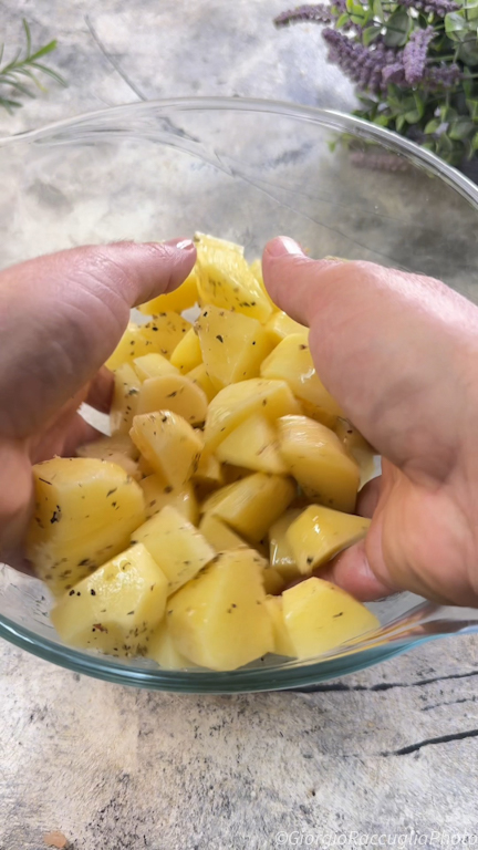 Transfira para uma tigela as batatas cortadas em cubos e tempere com o sal,