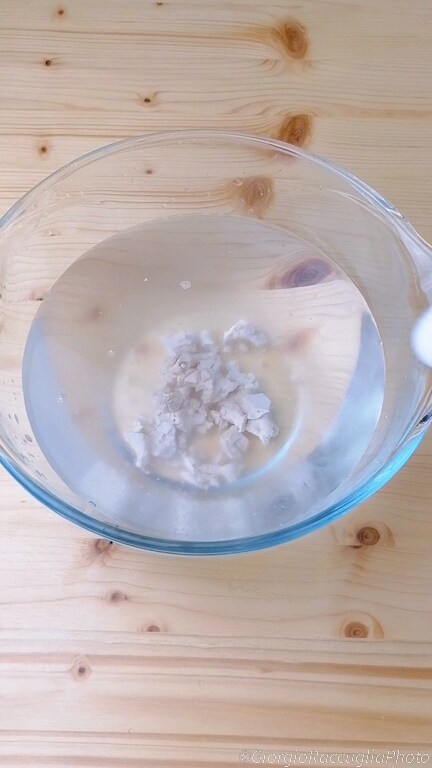 Para preparar a receita das zeppole de massa de pizza, comece dissolvendo o fermento em uma tigela com água,