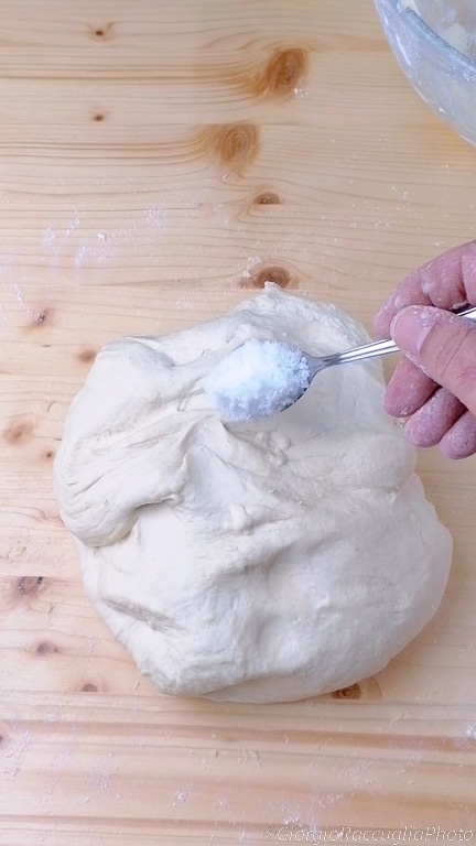 forme uma bola que você colocará para crescer em uma tigela, coberta com filme plástico, em forno desligado com a luz acesa por 2 horas.