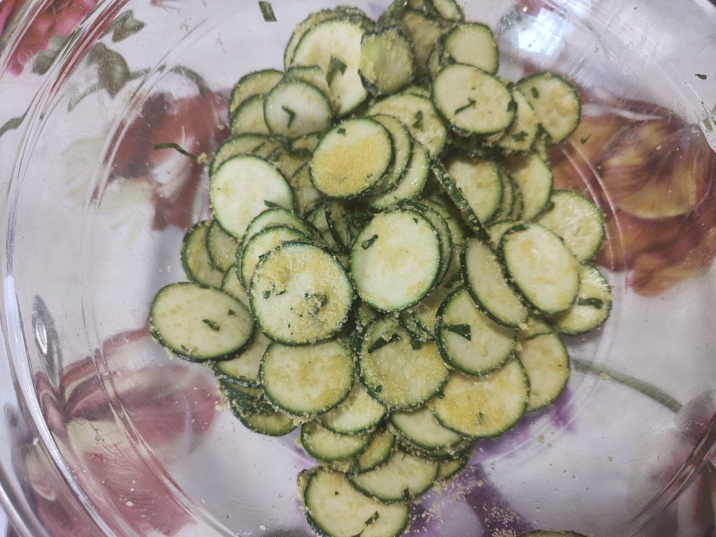 Aqui estão as nossas abobrinhas gratinadas na fritadeira a ar, bem douradas e crocantes.