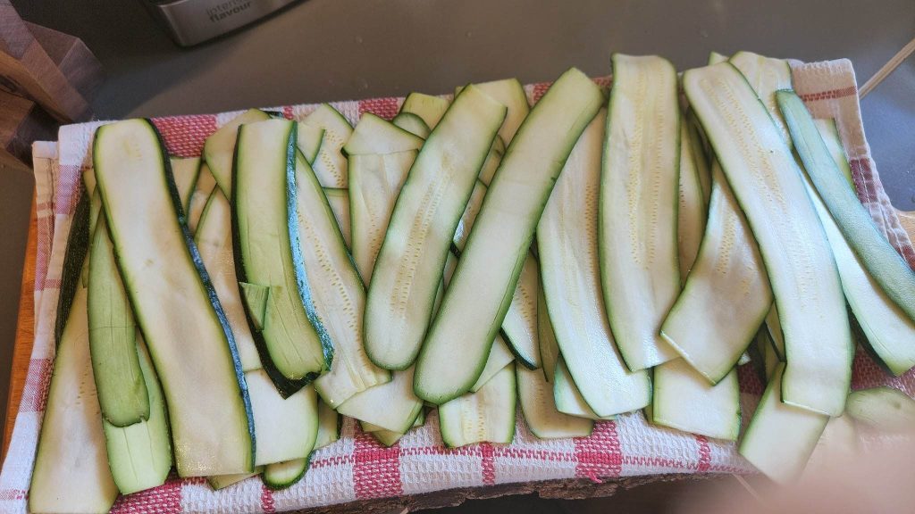 • Em seguida, faça outra camada de abobrinha e tempere com a marinada, continue assim até esgotar os ingredientes.