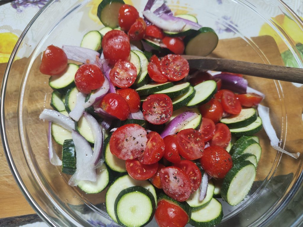 Você pode usar as abobrinhas ou os vegetais que preferir ou que tiver na geladeira, mas tente criar cubos ou tiras que tenham o mesmo tamanho para garantir um cozimento homogêneo.