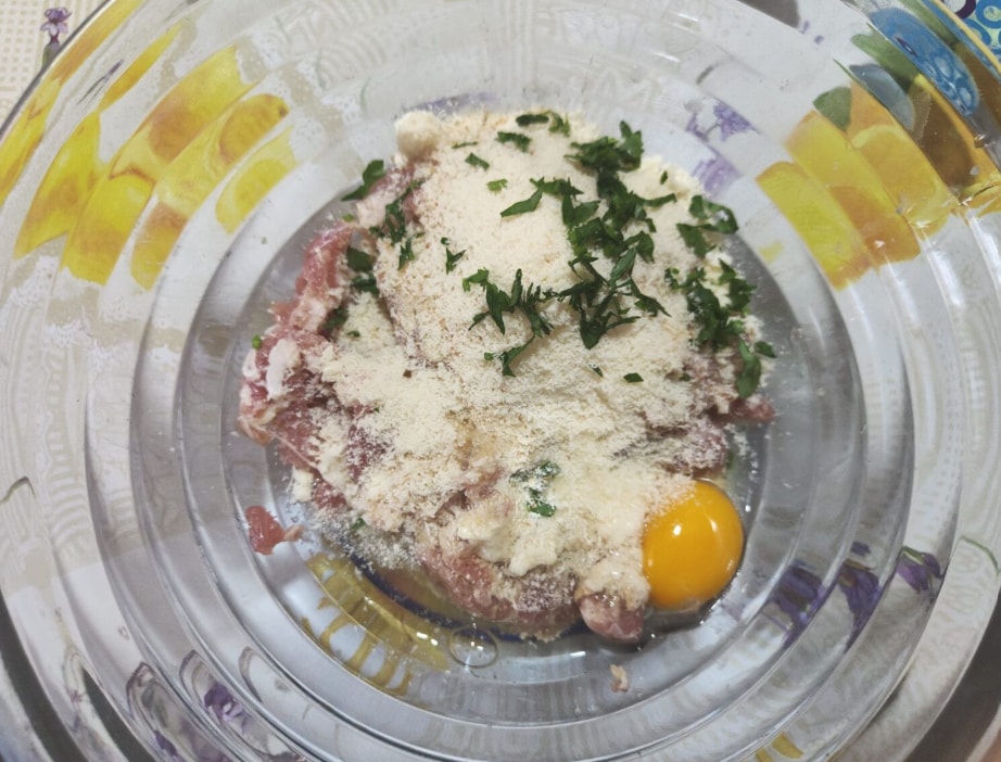 Em uma tigela grande, junte a carne moída, o pão embebido e espremido, o alho e a salsinha picados, o queijo ralado, o ovo, sal e pimenta.