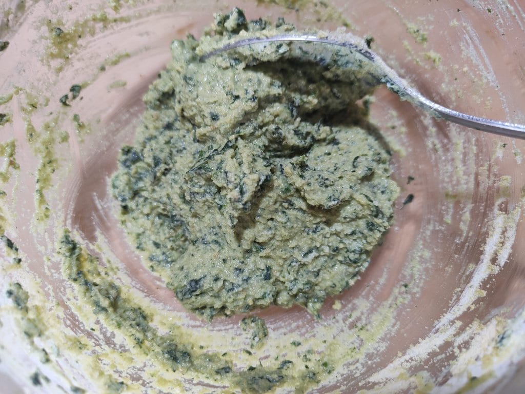 Adicione ao processador de espinafres e grãos de bico a farinha de grão de bico e misture até obter uma massa homogênea.