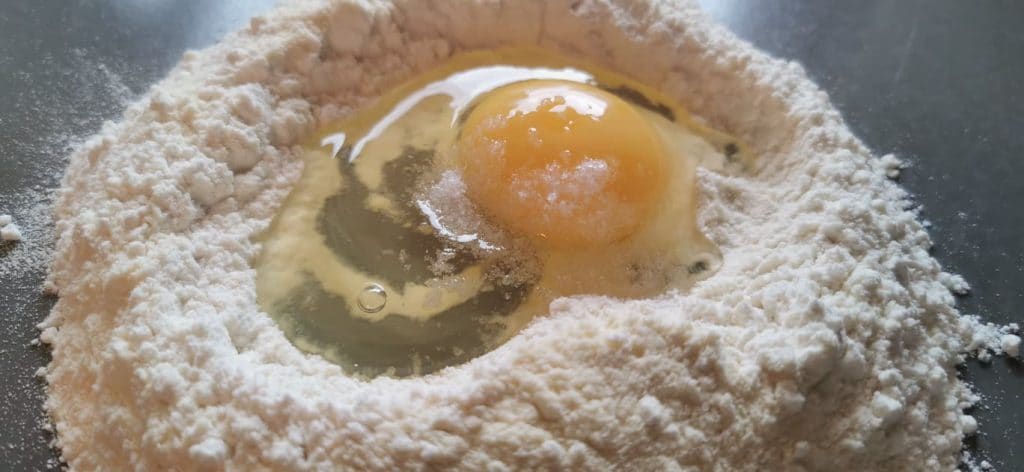Disponha as farinhas em forma de vulcão e coloque os ovos no centro. Bata levemente com um garfo.