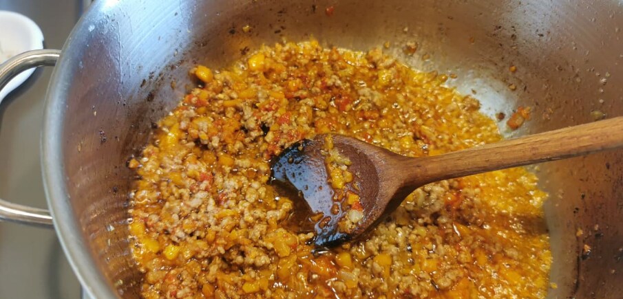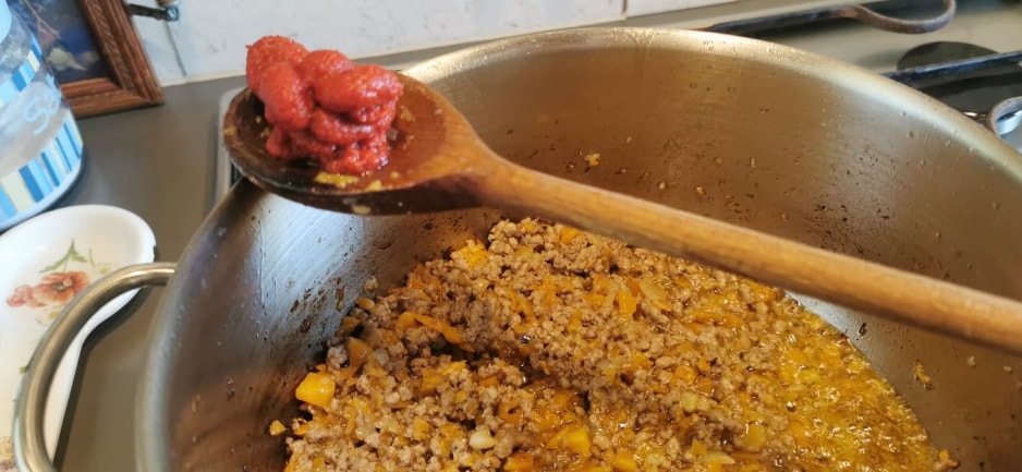 Em seguida, adicione o vinho. Quando o vinho tiver evaporado, adicione uma colher de sopa de extrato de tomate e misture.