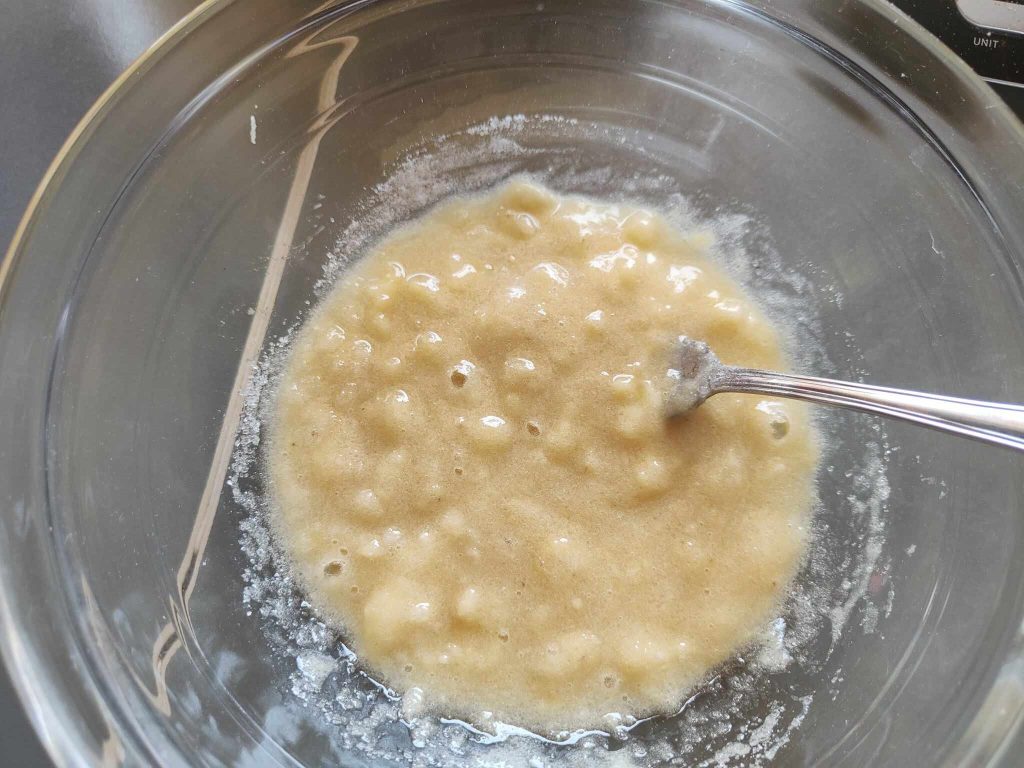 Amasse as bananas com um garfo em uma tigela grande, adicione o açúcar.