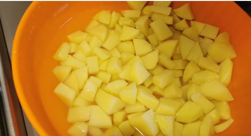 Primeiro, lave bem as batatas e corte em cubos não muito pequenos (deixando a casca) se preferir.
