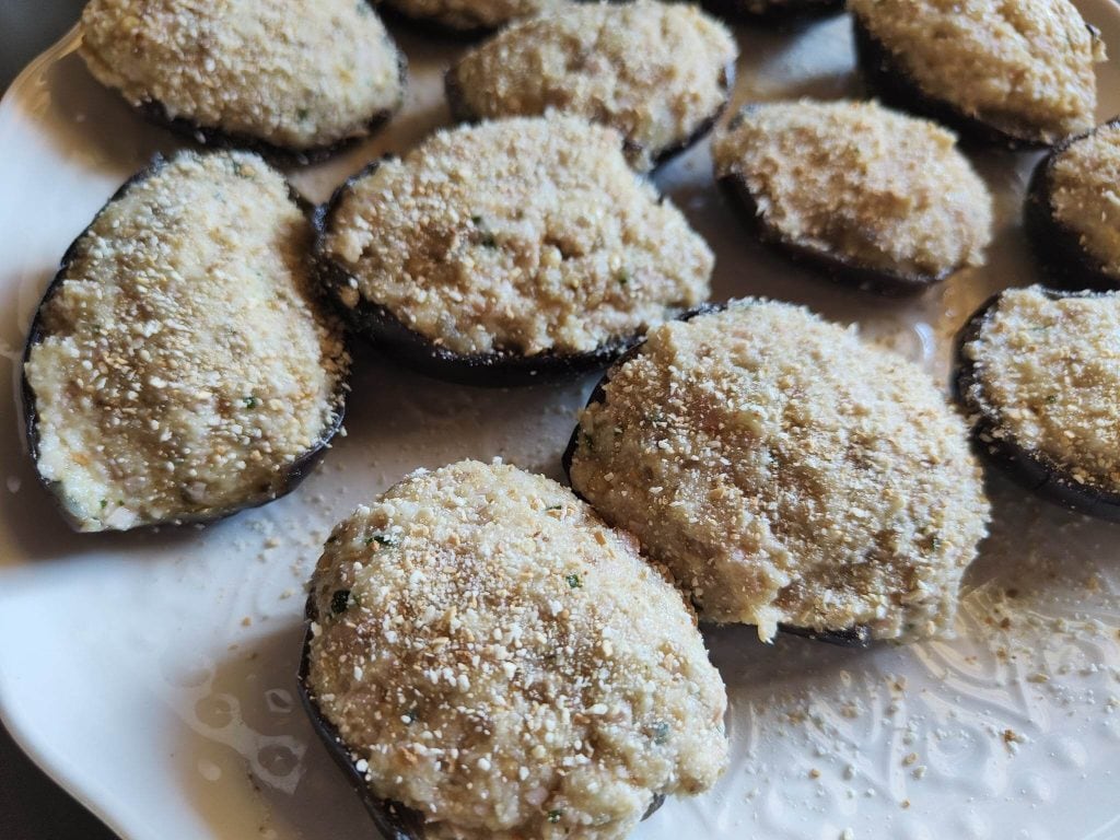 Em uma tigela, trabalhe o pão amolecido, a polpa de berinjela cortada em pedaços pequenos, os ovos, os queijos ralados, o alho e a salsa picada, ajuste o sal e a pimenta e misture muito bem.