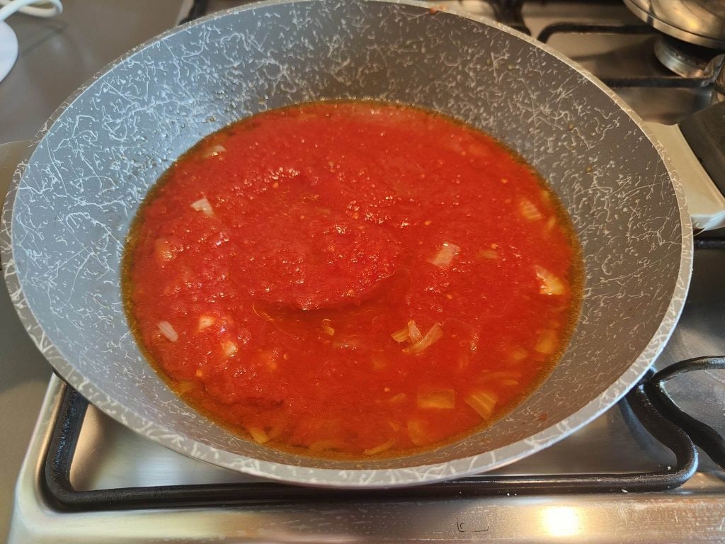 • Enquanto isso, em uma panela, cozinhe um molho, um molho muito simples com um pouco de óleo, cebola finamente picada e depois cozinhe um pouco de passata de tomate por cerca de 30 minutos.