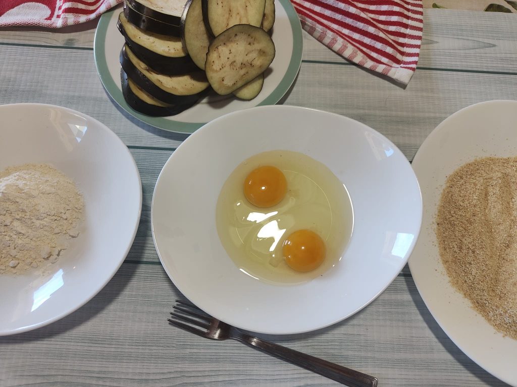 • Passe as berinjelas na farinha, no ovo batido e na farinha de rosca.