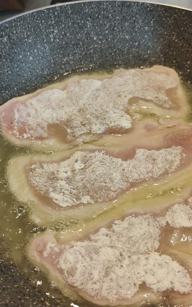 • Colocamos os bifes de peru em uma tigela, adicionamos a farinha e o sal e misturamos com as mãos para cobrir toda a carne com farinha.