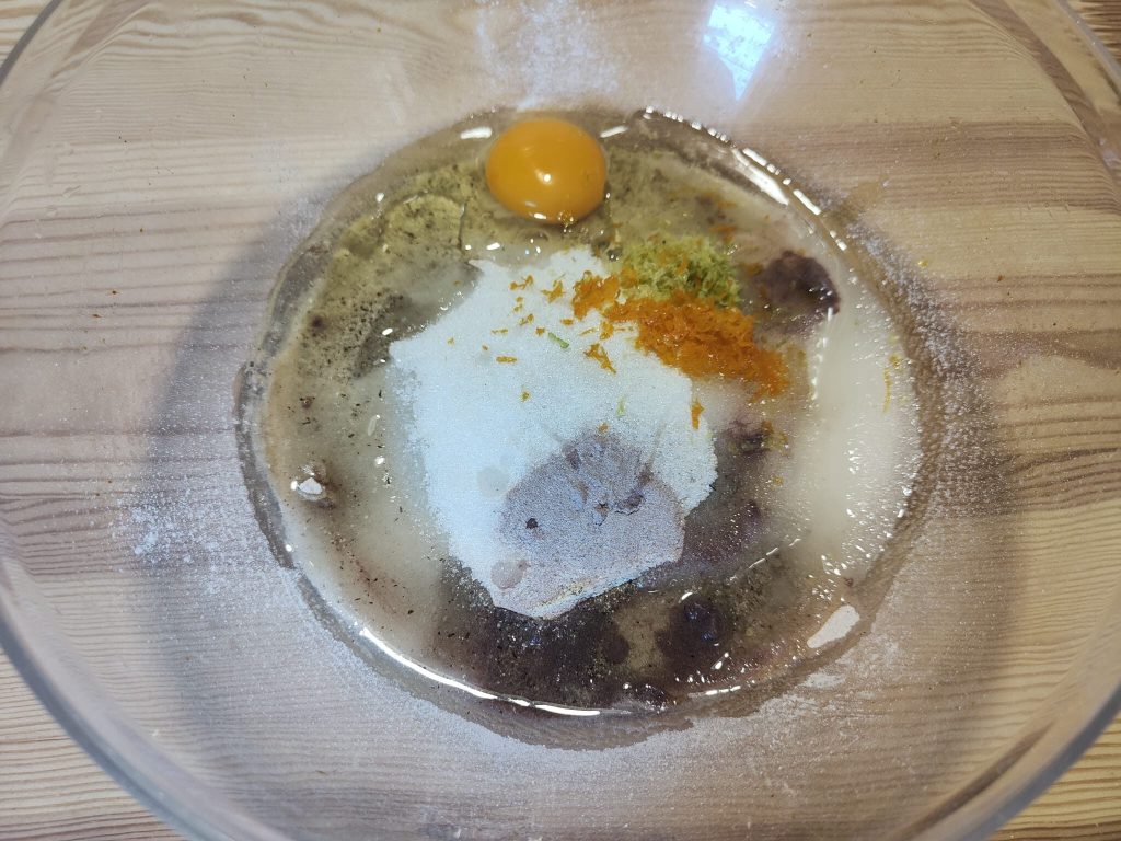 Por esse motivo, à farinha de trigo sarraceno, adicionei uma boa quantidade de raspas de laranja e limão, o que ajuda a suavizar a predominância do cereal em questão.