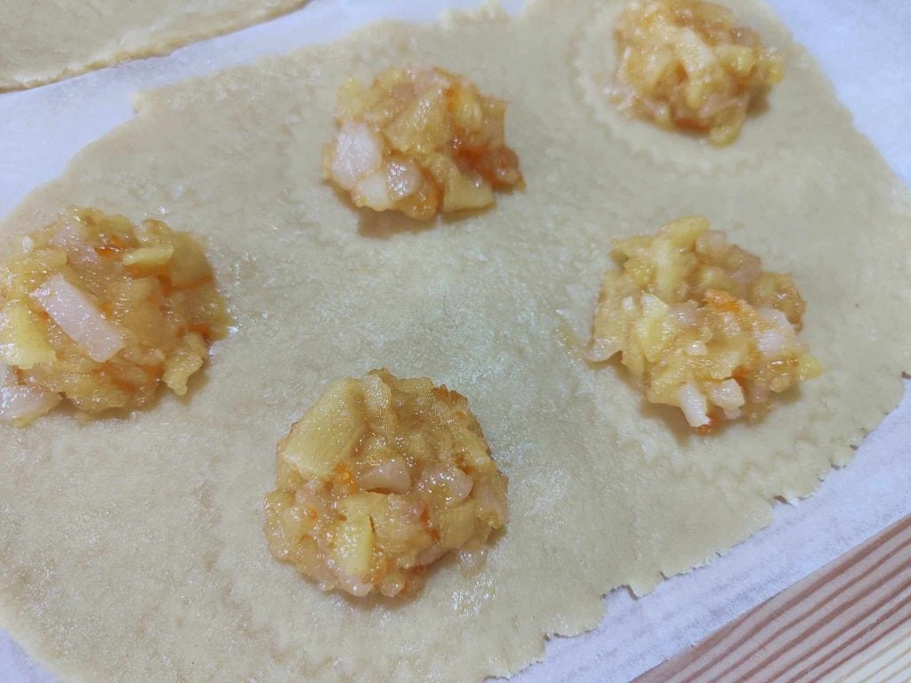 Na metade da superfície da massa, coloque 1/2 colheres de chá do recheio de maçã, mantendo a distância adequada entre um biscoito e outro.