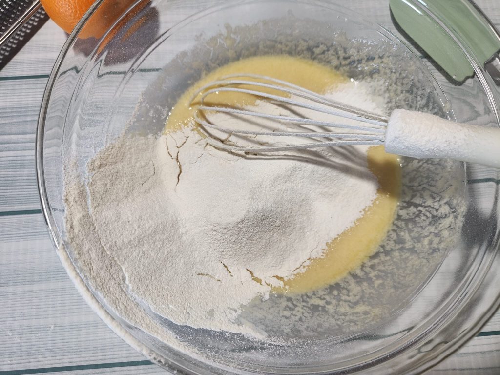Adicione a farinha de trigo 00 e o fermento para bolos, obviamente peneirados.