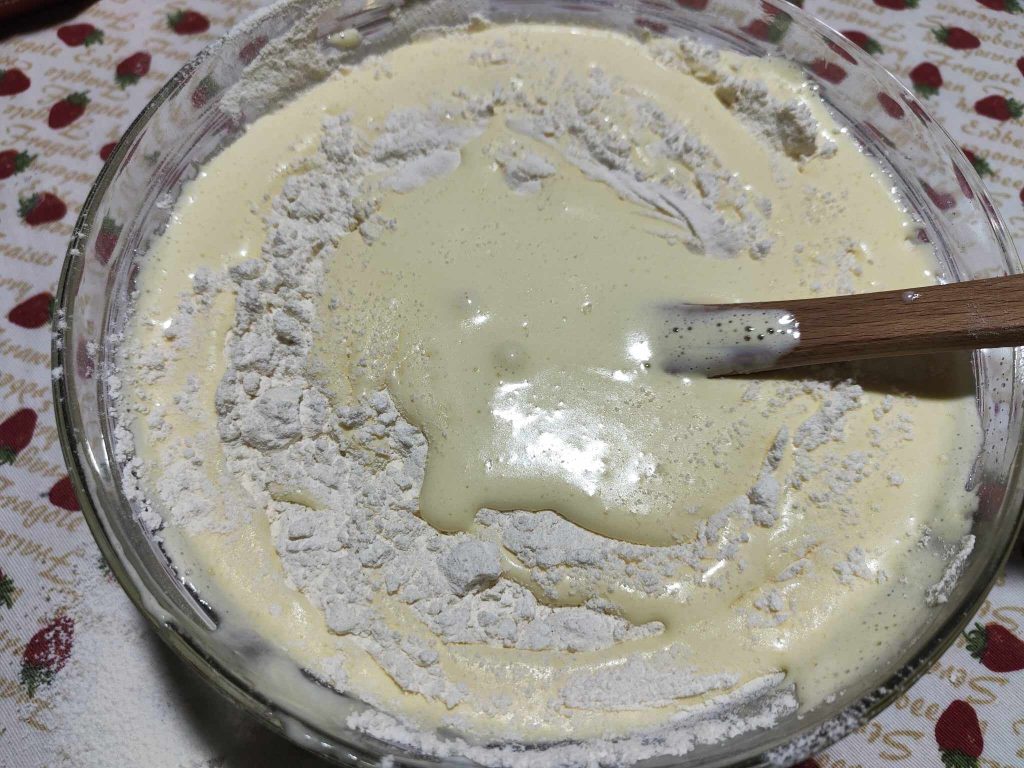 Adicione a farinha de trigo e o fermento em pó previamente peneirados.