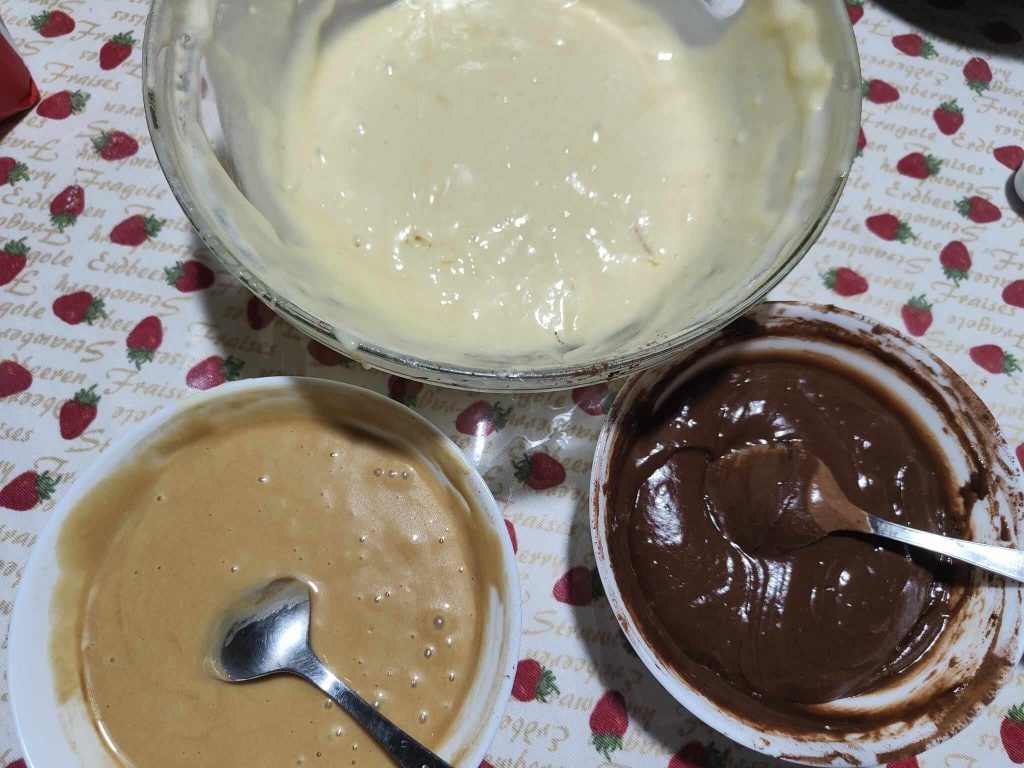 Despeje as massas, eu coloquei primeiro a de cacau, depois a de café e finalmente a de baunilha, você faz como preferir.