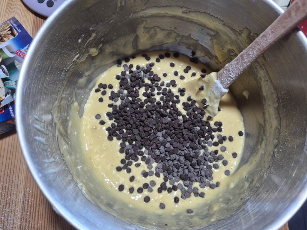 • Por fim, adicione as gotas de chocolate e as cerejas cristalizadas (destinadas ao interior). Misture delicadamente com uma espátula.