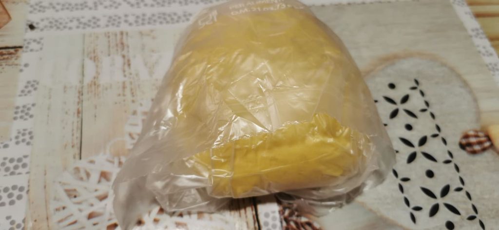 • Complete o trabalho da massa em uma tábua, envolva-a em filme plástico e deixe descansar na geladeira por cerca de meia hora.