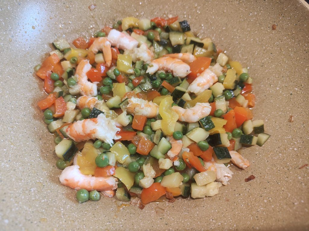 É um prato completo, carboidratos, legumes e as proteínas dos camarões e vôngoles.