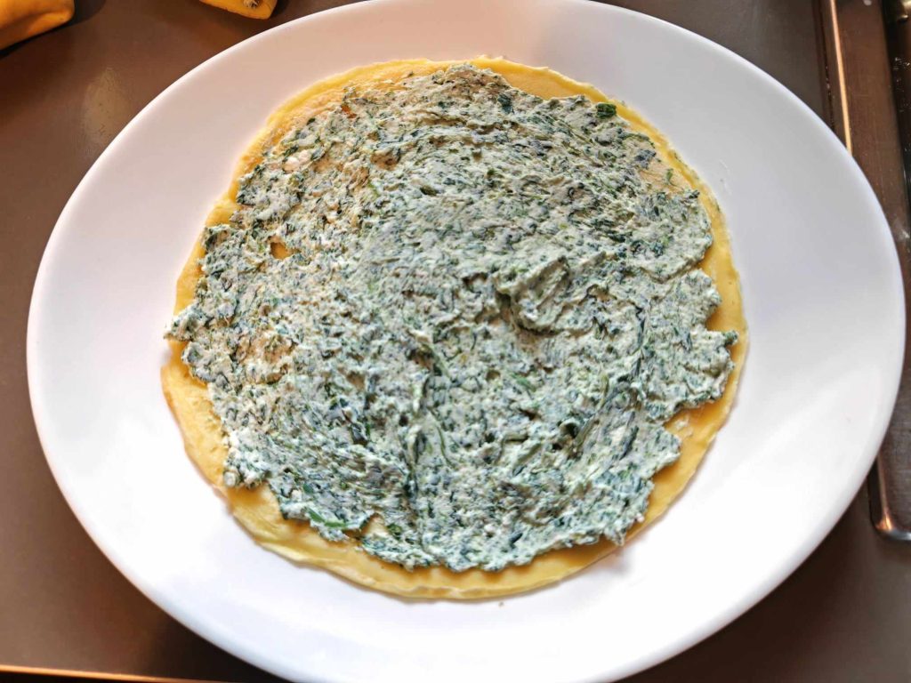 Pegue a primeira crepe e espalhe uniformemente com o recheio, enrole e continue assim com todas as outras.